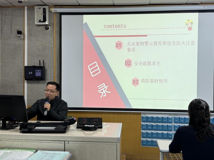 培训会上,王启立结合高校实际情况,系统梳理了校园内常见的火灾类型,并通过真实案例深入剖析火灾成因及教训,为同学们敲响了安全警钟。随后,他通报了近期学生宿舍安全检查中发现的突出问题,如人离未断电、阳台堆放杂物、用电安全意识薄弱等,希望各宿舍长切实履行职责,带头整改并督促室友共同维护宿舍安全。