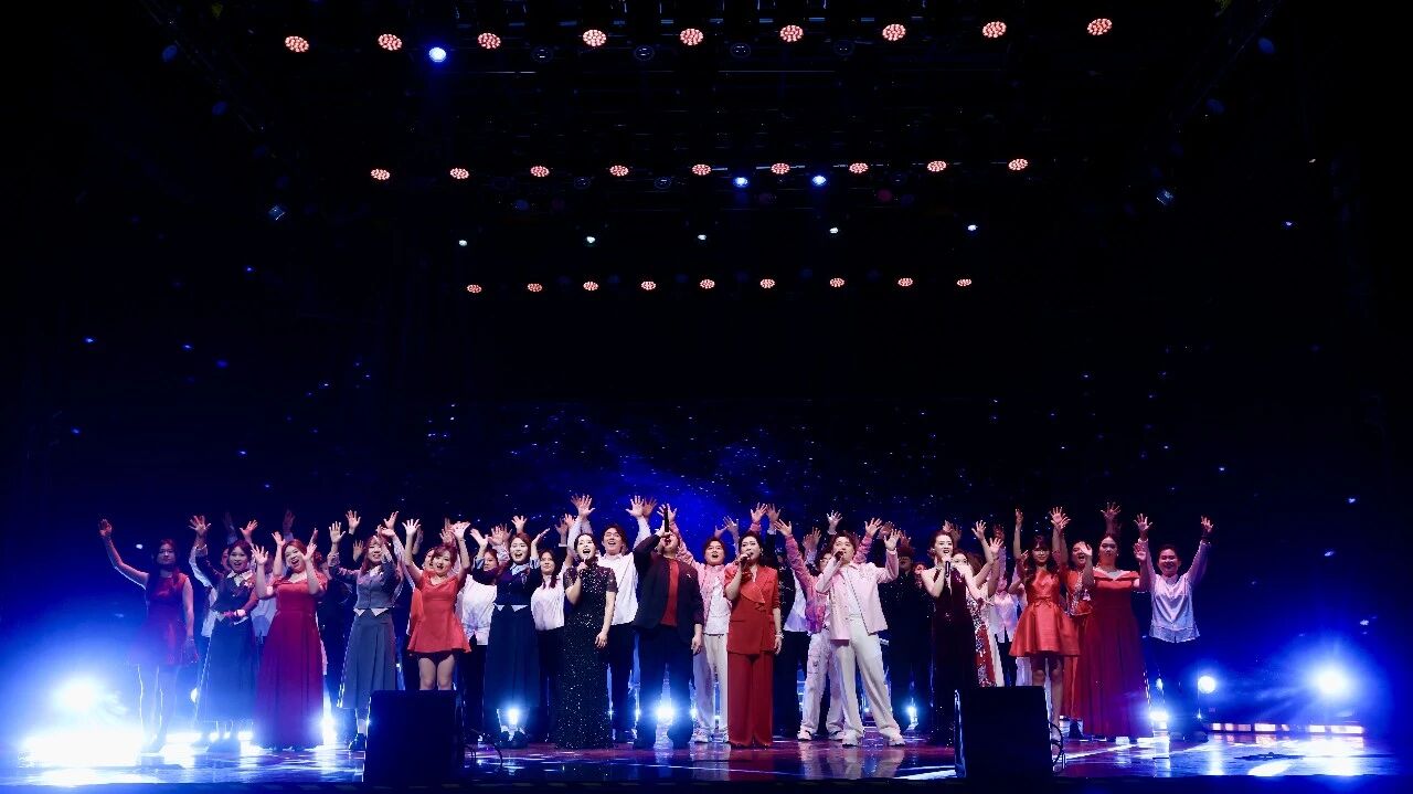 第一篇章“星火初燃,信仰之光”中开篇独唱与双人舞蹈《绒花》,深情演绎革命者的青春与奉献;独唱《愿你再见我时》旋律悠扬,情感真挚;双手风琴与乐队《流金岁月》以明快热烈的节奏,再现了革命年代的乐观主义精神;《红歌组曲》则通过经典旋律联缀,唤起观众对红色历史的集体记忆。第二篇章“烽火弦歌,人民之声”中小合唱《映山红》《红岩牧笛映朝霞》等作品,以清新优美的和声,歌颂了人民对光明与胜利的向往;《如愿》《以人民的名义》等歌曲,用当代青年熟悉的音乐语汇,表达了对革命先辈的敬意与对“人民至上”价值的深刻认同。第三篇章“潮涌东方,奋进之志”以充满力量与信念的《我相信》开场,校友与在校生同台,唱出对理想与未来的坚定;独唱《绿叶对根的情谊》深沉含蓄,抒发了对祖国母亲的眷恋;合唱《星辰大海》《我爱你中国》以磅礴大气的编曲与充满激情的演唱,将新时代青年的爱国情怀与奋斗志向抒发得淋漓尽致,现场气氛热烈高涨。第四篇章“风华长歌,时代之问”在《千年之约》的悠远歌声中展开,连接历史与未来;《错位时空》等作品以青春化的表达,实现与革命先辈的跨时空对话;《亲爱的中国我爱你》《红旗飘飘》《大中国》等经典歌曲联唱,引发全场共鸣;乐队合奏《广寒宫破阵曲》则以现代器乐编配展现传统题材的磅礴气韵;最终,全场在深情恢宏的合唱《天耀中华》中圆满落幕,歌声中寄托着对祖国繁荣昌盛、民族伟大复兴的诚挚祝福。