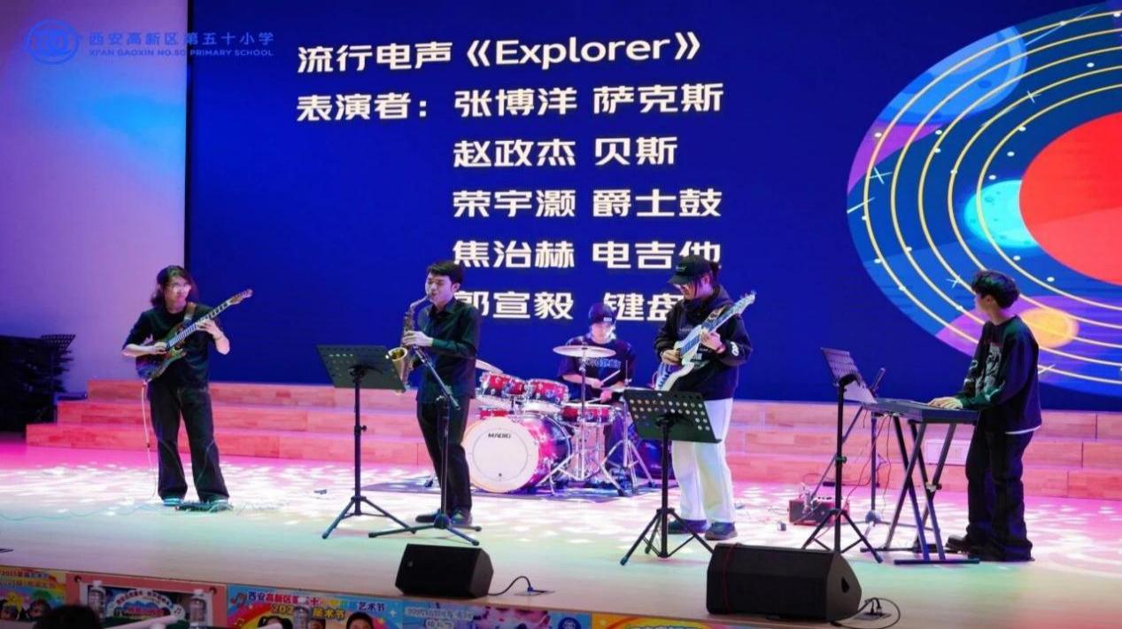 活动现场,电声乐队呈现了《Explorer》等精彩曲目,以精湛的演奏技艺展现了现代音乐的独特魅力,获得了在场师生的热烈反响。之后与现场的小学生们就乐器介绍、发音试听进行体验式自由交流,成功点燃了孩子们对音乐艺术和现代音乐的浓厚兴趣。
