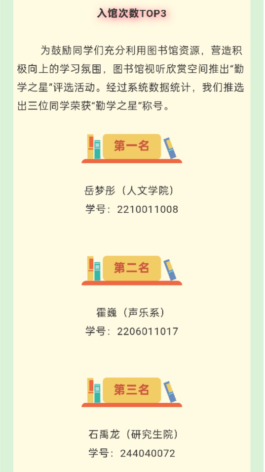 在评优激励方面,图书馆通过表彰优秀读者激发师生学习热情。图书馆综合本年度借阅量和数据库使用情况,评选出“读者之星”,表彰了6名师生;依据入馆次数统计发布的“勤学之星”榜单,则评选出3位到馆学习的校园榜样,形成“以评促学”的良性循环。