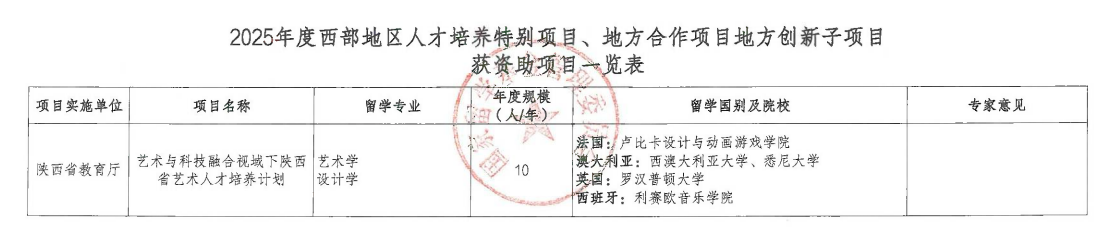 近日,国家留学基金管理委员会(CSC)正式公布《关于确定2025年度西部地区人才培养特别项目、地方合作项目地方创新子项目获资助项目的通知》(留金项〔2025〕38号),我校联合西安美术学院共同牵头,携手英国罗汉普顿大学、澳大利亚悉尼音乐学院、西澳大学、西班牙利赛欧音乐学院等5所国际知名艺术院校共同申报的“艺术与科技融合视域下陕西省艺术人才培养计划”成功获批,这也是我校首次获得国家留学基金委此类项目立项。