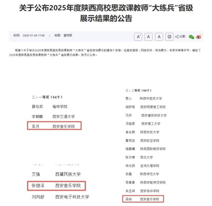 1月4日,中共陕西省委教育工委、陕西省教育厅发布《2025年度陕西高校思政课教师“大练兵”省级展示结果的公告》,我校马克思主义学院青年教师吴月、张继泽获得一等奖,梁肖获得二等奖。