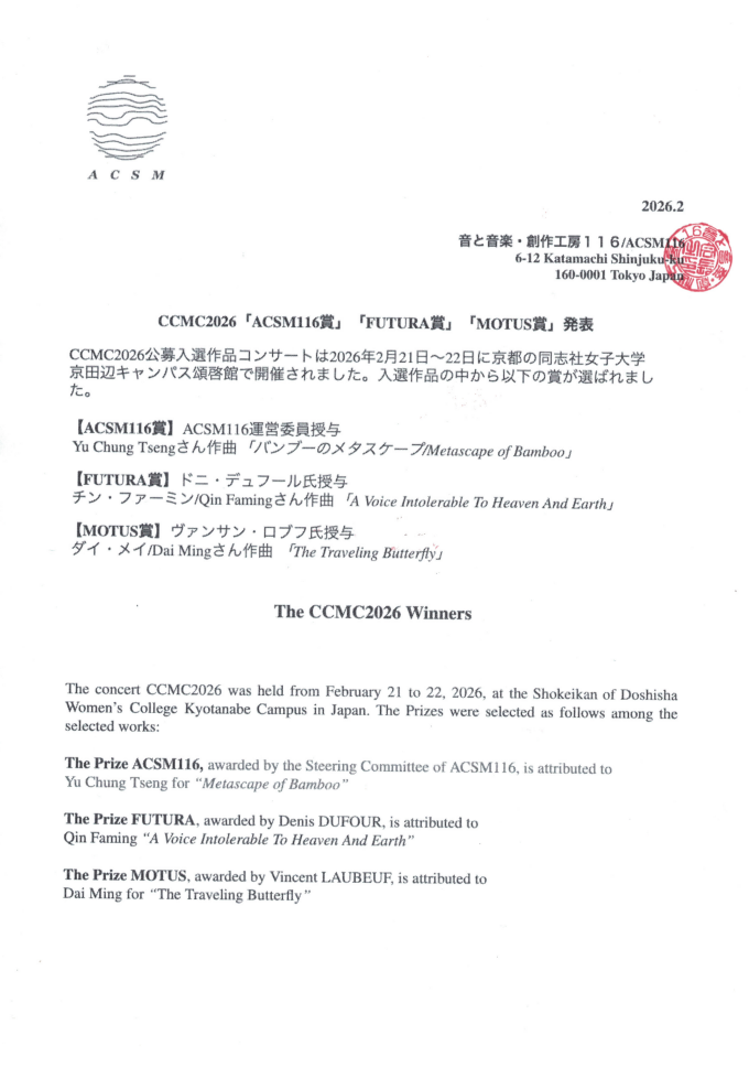 在刚刚落幕的亚洲极具影响力的计算机音乐学术活动——中国计算机音乐大会(CCMC)上,秦发鸣创作的《A Voice Intolerable to Heaven and Earth》成功上演并脱颖而出,荣获大会颁发的FUTURA Prize,其本人也凭借此作品获得推荐,将受邀参加2026年暑期法国FUTURA电子音乐节,并在音乐节上展演其全新创作作品。此外,该作品还成功入选SEAMUS 2026美国电声音乐协会国家会议音乐会单元,将于5月20日至23日在美国德克萨斯大学圣安东尼奥分校(UTSA)进行专场展演。