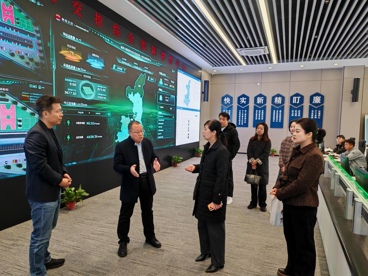 当天上午,考察团首先抵达陕西交控综合能碳调度中心,陕西交控绿色发展集团有限公司副总经理解瑞松、绿发智能科技公司副总经理秦强热情接待,并为考察团进行详细讲解。考察团一行认真了解企业发展布局、运营管理模式及绿色发展理念,直观感受陕西交控集团在交通运营、智慧管理、绿色发展等领域的雄厚实力与创新成果,为后续校企合作对接奠定了坚实基础。