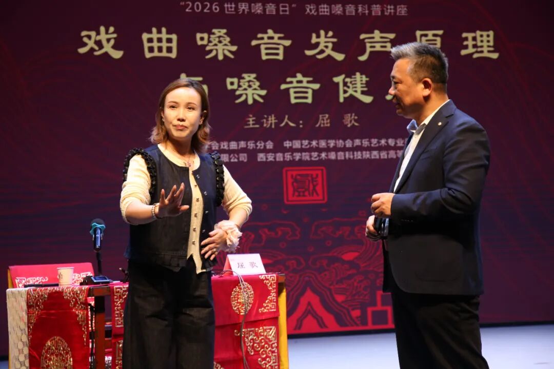 活动中,中国戏曲学会戏曲声乐分会负责人、西安音乐学院屈歌副教授结合自身在歌唱科学、嗓音健康的丰富经验,深入浅出地讲解了戏曲嗓音审美“七字诀”——水、亮、响、堂、宽、净、脆,系统阐释了呼吸动力、声带振动、腔体共鸣、咬字吐字四大生理系统的协同原理,并现场演示了运用嗓音调整技术快速帮演员实现“声音立刻变松、音量显著增大、高音不再费力”的立竿见影效果。他还特别强调了系统化嗓音热身、喊嗓念白、日常保健及嗓音疾病预防等实用知识,并现场示,范赢得在场演职人员阵阵掌声。