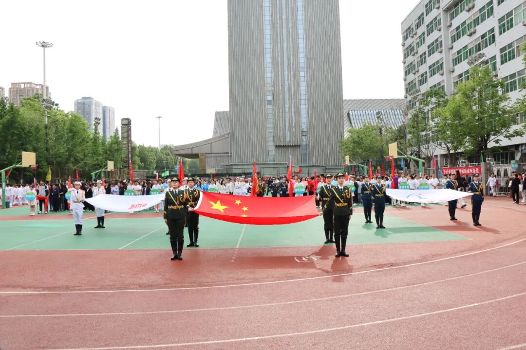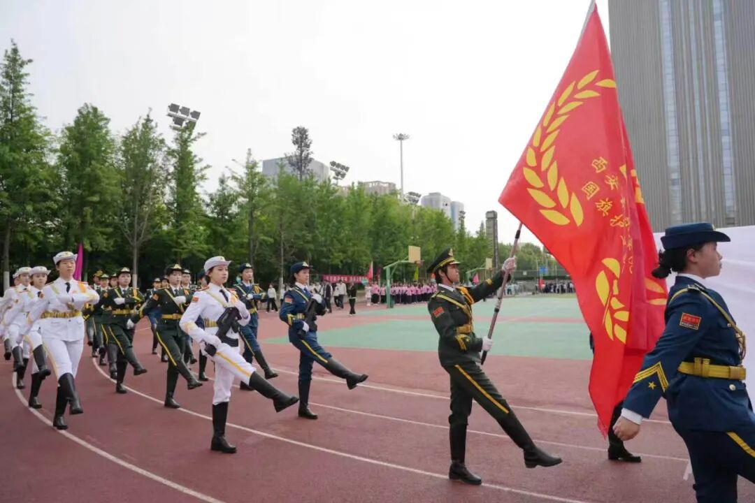当《运动员进行曲》的激昂旋律响起,开幕式入场仪式正式开始。首先映入眼帘的,是国旗护卫队的同学们。他们高举鲜艳的五星红旗,步履铿锵,身姿挺拔,气宇轩昂,以青春之名护卫国旗之威。紧随其后的是校旗与会旗方阵,凝聚着西音人 “明德教化、乐音至善” 的初心与坚守,承载着全体师生奋勇争先、团结拼搏的运动精神。