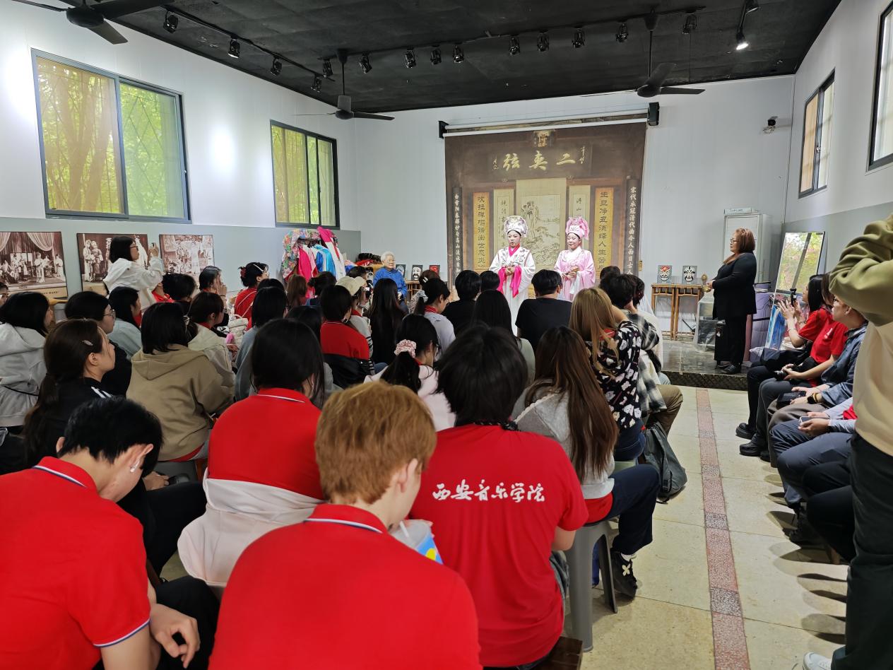 当日下午,师生针对国家级非物质文化遗产代表性项目二夹弦,展开实地调研学习。在参观二夹弦展示馆后,国家级非遗代表性传承人田爱云老师、市级非遗代表性传承人吴筱曼、区级非遗代表性传承人吴小玲老师向师生们共同讲述了二夹弦的唱腔体系、行当划分与服饰规制,并示范了标准身段与演唱技法。在最后的互动环节中,师生穿戴戏曲服饰,体验戏曲表演,在专业指导下切身感受戏曲表演的内核。