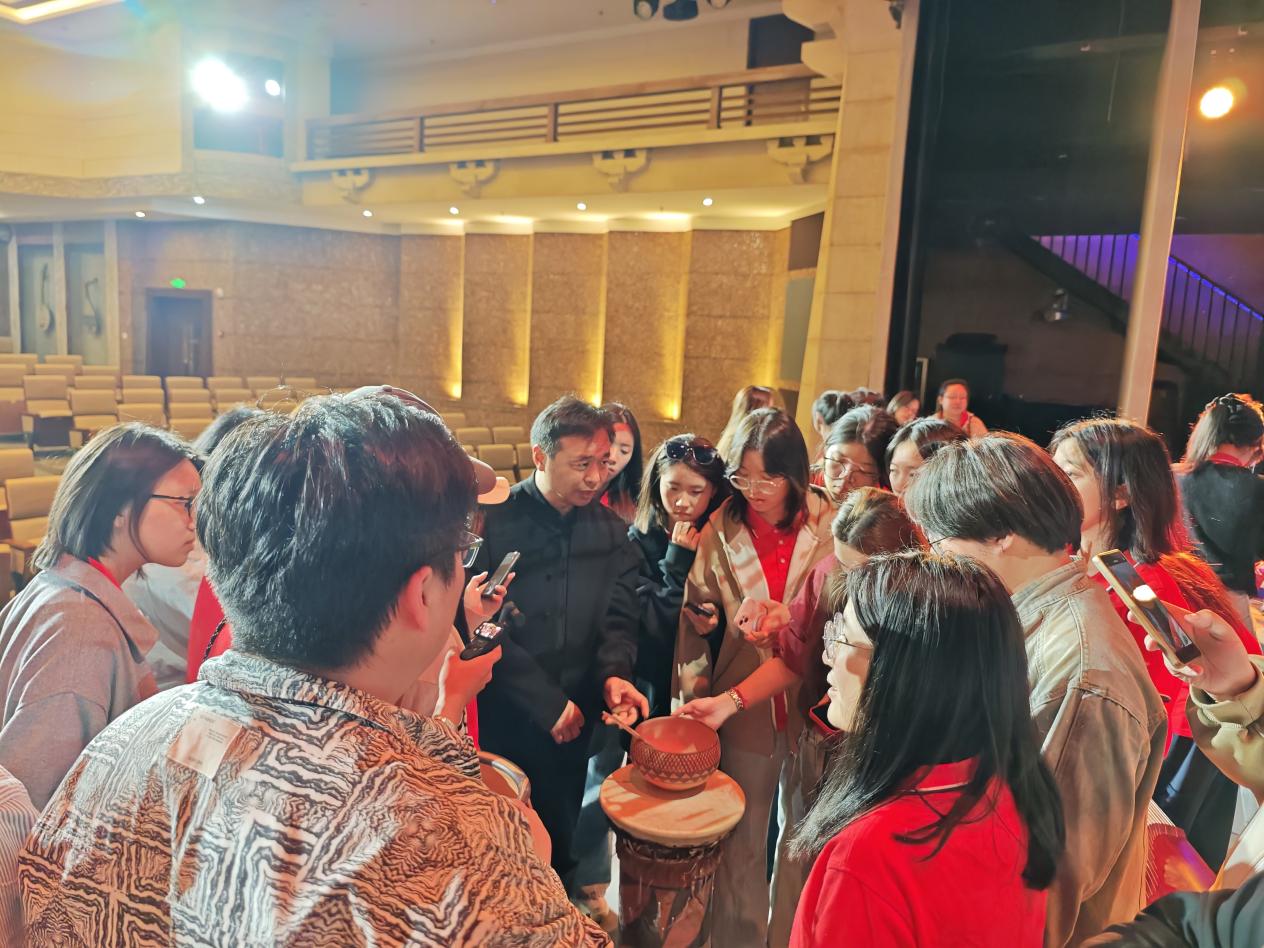 当日下午,师生一行走进河南博物院,聚焦音乐考古学展开田野考察。通过对贾湖骨笛、先秦编钟等珍贵音乐文物的近距离观摩,以及对致力于古乐复现的华夏古乐团及其“活态展演”进行了沉浸式体验,同学们直观感受到了从远古音雏到唐宋乐舞的华夏音乐演进轨迹。在随后的学术交流会上,师生与乐团专家就出土乐器的复原理念、音乐考古方法论等议题展开了深度对话。学生们还亲身试奏编钟、编磬等复原乐器,切身感悟“一钟双音”的声学奇迹与金石合鸣的礼乐传统,为“图像—文本—现场”三位一体的研究范式提供了生动实践。