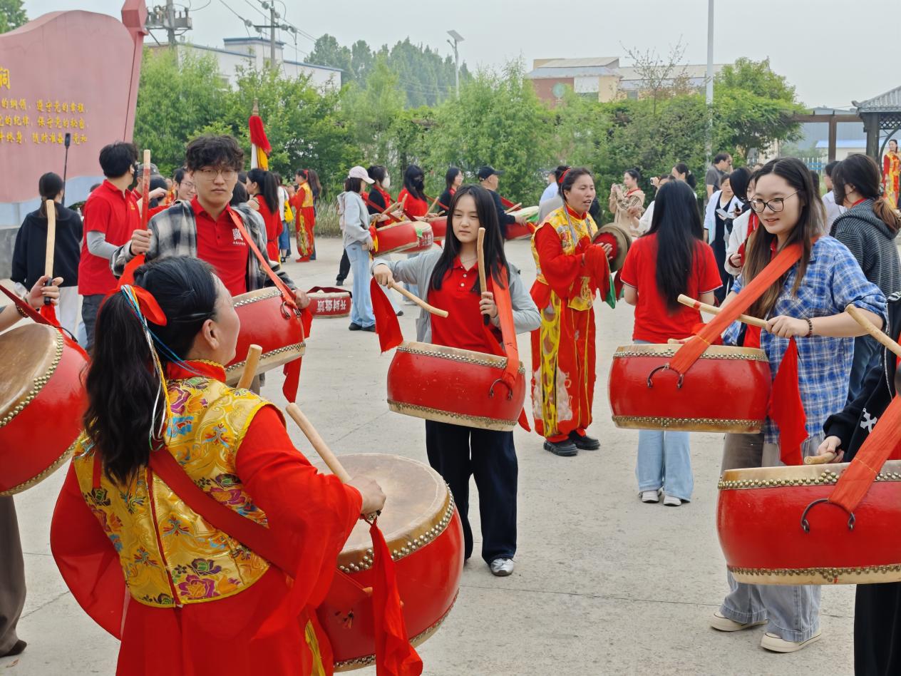 4月27日上午,采风团队首先抵达开封市祥符区兴隆村,对国家级非遗项目“开封盘鼓”进行调研。通过观摩、访谈与亲身体验相结合的方式,师生们系统记录了开封盘鼓的表演程式、乐器形制与传承谱系,并与国家级非遗传承人王国海先生就该乐种的生存现状与发展困境进行了深入交流,为地方音乐史与非遗保护研究积累了宝贵的一手资料。