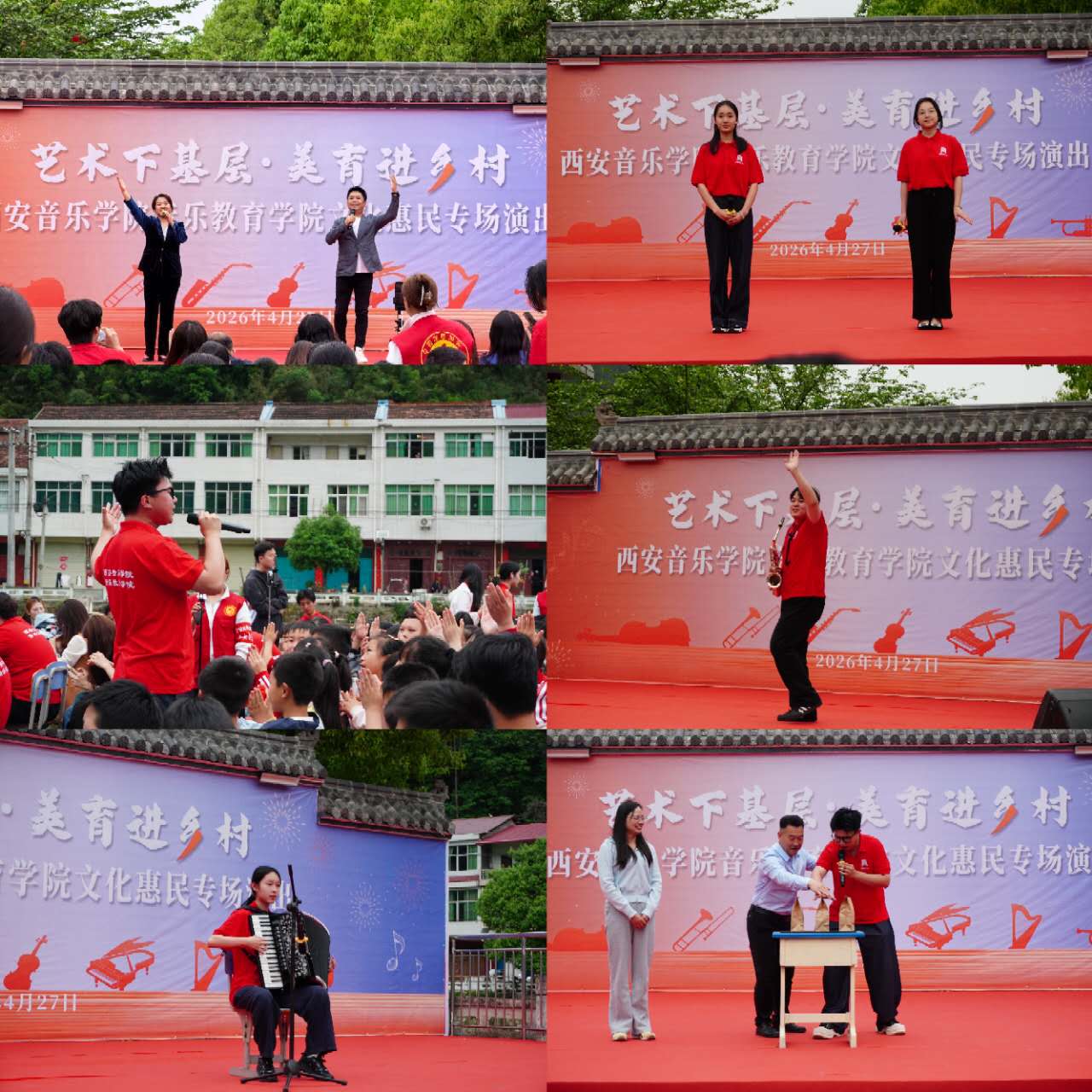 文艺下乡润民心,文化惠民促振兴。学院师生在代家坝镇开展专场文化惠民演出,为当地群众、师生送上高品质视听盛宴。萨克斯独奏、民族独唱、古筝演奏、手风琴串烧、集体合唱等节目轮番上演,红色经典与时代旋律交织,《红旗飘飘》《不忘初心》等精彩曲目,既弘扬主旋律、传递正能量,又以多元艺术形式丰富乡村精神文化供给,切实以文化惠民行动,助力乡村文化振兴提质升级。
