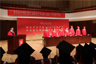 2021年6月29日,我校举行2021届研究生毕业典礼暨硕士学位授予仪式。党委书记张立杰,院长王真,党委副书记李宝杰、王刚,党委副书记、纪委书记刘晓霞,副院长仲廷虎、强陆平出席,全体硕士研究生导师共同见证了这一庄严神圣的时刻。典礼由研究生部主任郭强主持。 党委副书记李宝杰宣读授予决定 党委副书记王刚宣读表彰决定 为优秀论文获得者、优秀毕业音乐会获得者以及指导教师颁奖 为优秀毕业生及优秀学生干部颁发荣誉证书 为陕西省高校优秀毕业生颁奖 典礼在庄严的《中华人民共和国国歌》声中拉开帷幕。党委副书记李宝杰宣读学校《关于准予2021届赵雪等214名研究生毕业的决定》《关于授予2021届赵雪等214名研究生硕士学位的决定》《陕西省教育厅办公室关于表彰2021届陕西省高校优秀毕业生和优秀学生干部的通报》。党委副书记王刚宣读学校《关于表彰2021届硕士研究生优秀学位论文、优秀毕业音乐会的决定》《关于表彰2021届优秀硕士研究生毕业生、2021年度优秀研究生学生干部的决定》。与会校领导为8名优秀论文获得者、8名优秀毕业音乐会获得者以及指导教师、2名陕西省高校优秀毕业生、20名西安音乐学院硕士研究生优秀